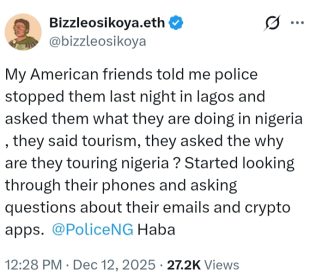GistReel A Nigerian man has raised concern on social media after claiming that his American friends were stopped and questioned by police ...Lady reflects on her past, says she’s done with multiple relationships at 28
