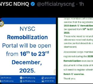 GistReel The National Youth Service Corps (NYSC) has disclosed that its registration portal for the 2025 Batch ‘C’ remobilisation exercise will be ...Ugandan lady over the moon after receiving Nigerian Visa, says dream come true