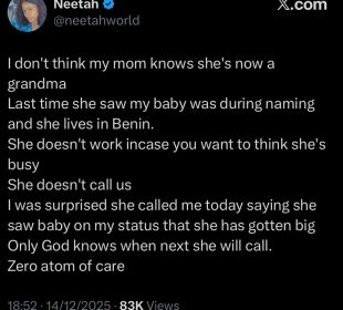 GistReel A Nigerian lady has sparked reactions on social media after publicly calling out her mother for what she described as a ...“You only saw my baby once” – Lady calls out her mother for failing as ...