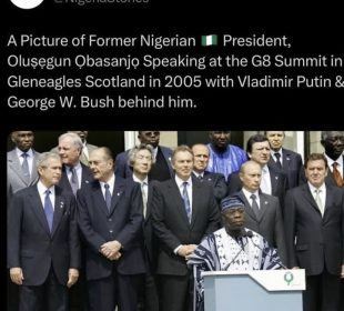 GistReel An old photo of former Nigerian President Olusegun Obasanjo speaking at the 2005 G8 Summit in Gleneagles, Scotland, with Russian President ...“There was a country” – Old photo of Obasanjo with Putin, Bush behind him in ...