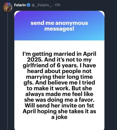 Man reveals plan to invite girlfriend of 6 years to his wedding