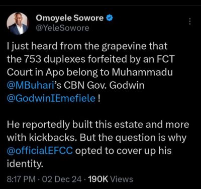 753 duplexes forfeited by court belongs to Emefiele – Sowore reveals