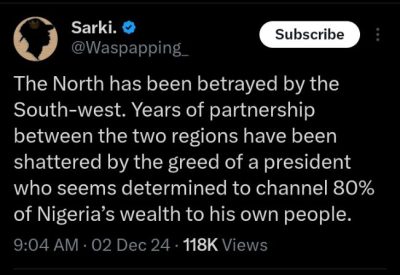 GistReel An X user, identified simply as Sarki, has stated that the South West betrayed ... -