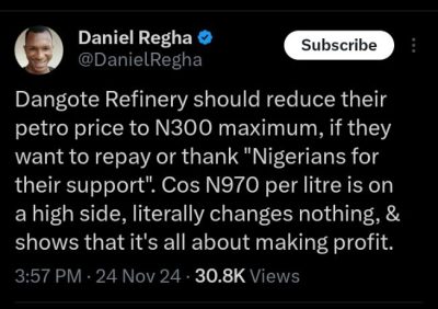 GistReel Social media influencer, Daniel Regha, has stated that the Dangote Refinery should sell its ... -