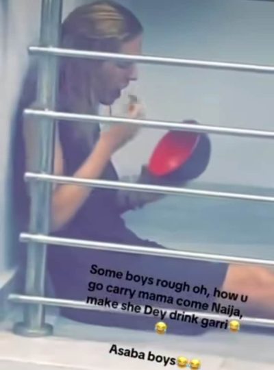 Mixed reactions trail video of Caucasian lady drinking garri on balcony