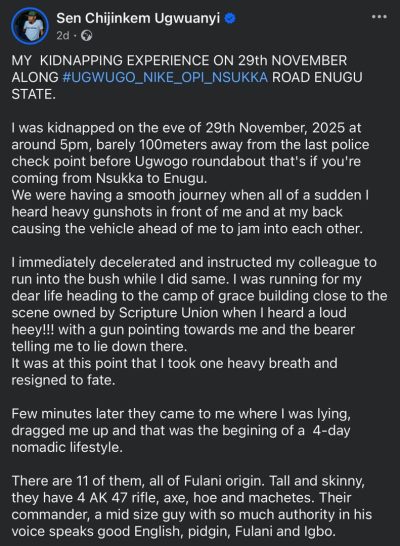GistReel A young man who survived a recent kidnapping along the Ugwogo Nike–Opi–Nsukka Road in ...