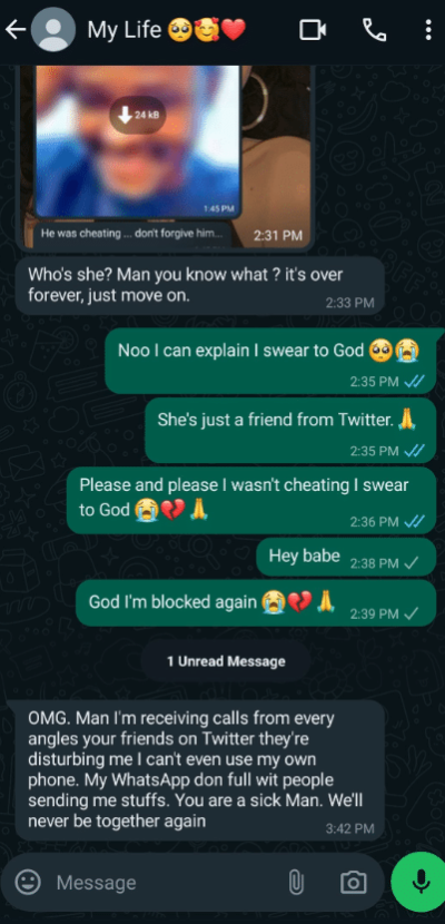 Man whose girlfriend suspects him of cheating cries out as she blocks him everywhere, posts ...
