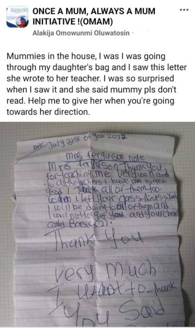 GistReel A Nigerian mother has displayed the letter her little daughter who’s in basic two ... -